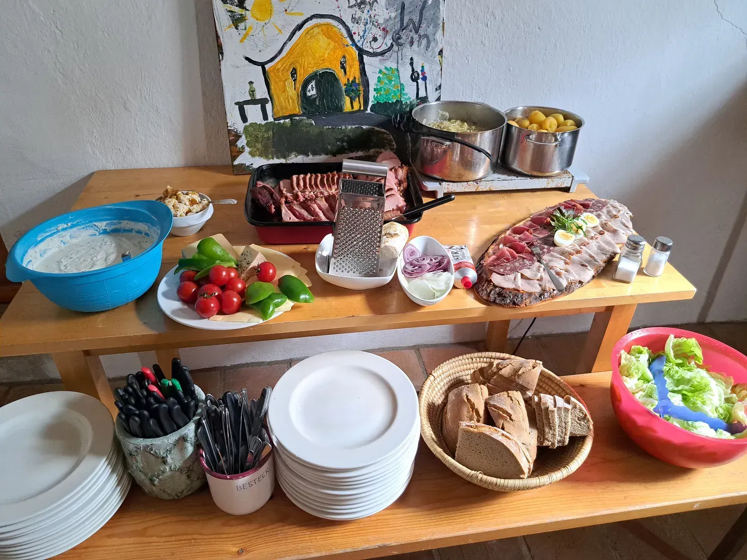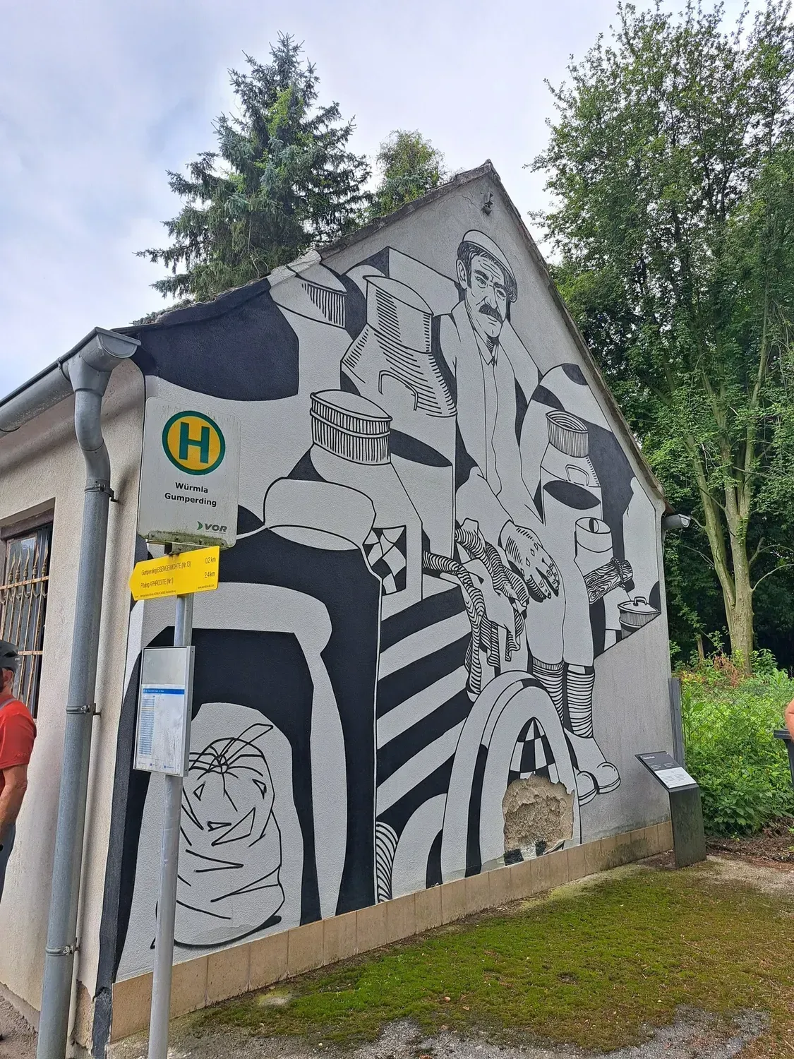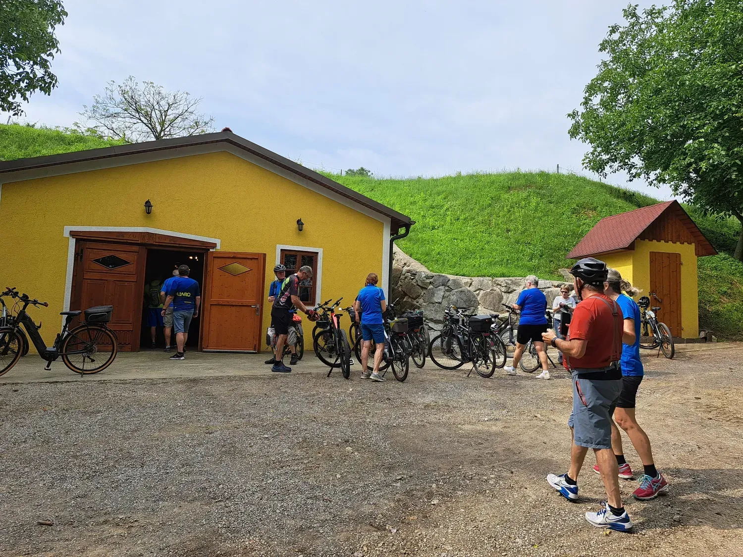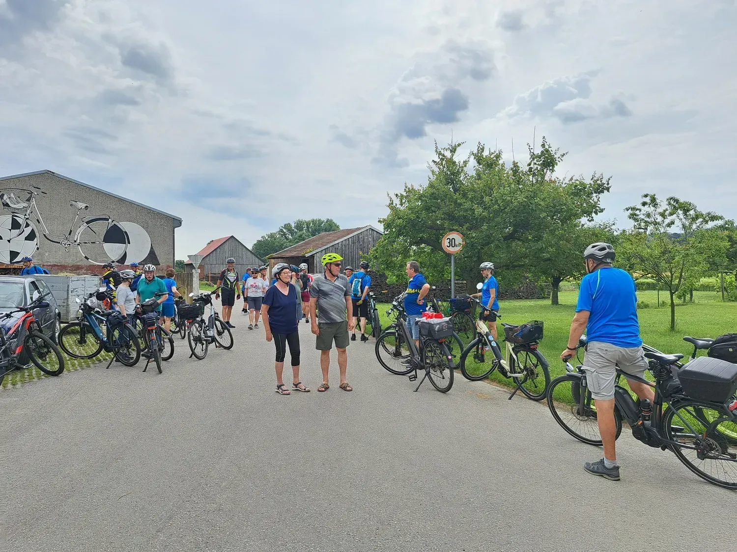 Um 8 Uhr startete unsere Radtour von der Mittelschule Laabental weg, entlang des Radweges bis nach Grabensee. Von dort radelten wir durch Habersdorf, Gr. Graben bis nach Waltendorf, wo unser Guide Lenz Muhr uns herzlich empfang. Gemeinsam gings weiter zu mehreren Würmlas Wänden - urbane Kunst auf ländlichen Fassaden, jede Wand erzählt seine eigene Geschichte. Bevor es zum Mittagessen ging, machten wir noch eine Trinkpause bei der Lorenzi-Rast in den Weinbergen. Danach ging es in den Weinkeller, wo uns Hermi mit köstlicher Hausmannskost verwöhnte. Da schon schwarze Gewitterwolken aufzogen, traten wir gestärkt in die Pedale Richtung heimwärts, leider hat uns in Neulengbach der Regen erwischt. Nach kurzer Wartezeit setzten wir unsere Radtour ohne Regen bis nach Hause, fort.