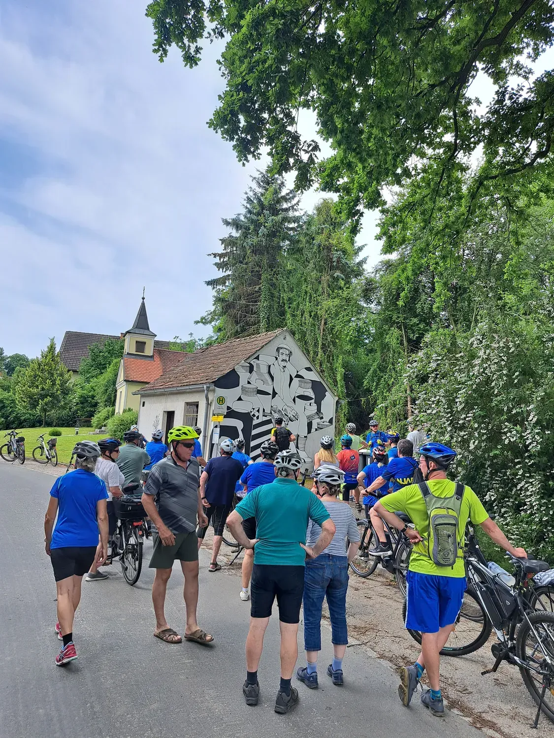 Um 8 Uhr startete unsere Radtour von der Mittelschule Laabental weg, entlang des Radweges bis nach Grabensee. Von dort radelten wir durch Habersdorf, Gr. Graben bis nach Waltendorf, wo unser Guide Lenz Muhr uns herzlich empfang. Gemeinsam gings weiter zu mehreren Würmlas Wänden - urbane Kunst auf ländlichen Fassaden, jede Wand erzählt seine eigene Geschichte. Bevor es zum Mittagessen ging, machten wir noch eine Trinkpause bei der Lorenzi-Rast in den Weinbergen. Danach ging es in den Weinkeller, wo uns Hermi mit köstlicher Hausmannskost verwöhnte. Da schon schwarze Gewitterwolken aufzogen, traten wir gestärkt in die Pedale Richtung heimwärts, leider hat uns in Neulengbach der Regen erwischt. Nach kurzer Wartezeit setzten wir unsere Radtour ohne Regen bis nach Hause, fort.